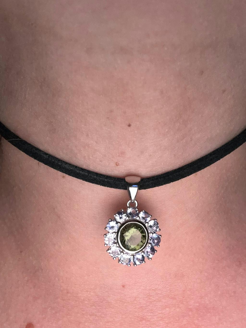 - Features a 7mm (1 ct) Moldavite center stone